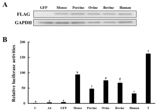 Comparison of enzymatic activities of HSD17B1/Hsd17b1 in various species. (A) Western blot analyses were performed with the antibodies against FLAG-tag and GAPDH using lysates of GFP- and FLAG-tagged HSD17B1/Hsd17b1 (mouse, porcine, ovine, bovine, and human)-introduced HEK293 cells. (B) Activation of AR-mediated transcription by culture media from GFP or each HSD17B1/Hsd17b1-introduced HEK293 cells collected at 2 h after A4 addition. CV-1 cells were transfected with ARE-Luc and AR expression vectors. At 24 h post-transfection, cells were incubated with vehicle (lane C), A4 (1 nM), T (1 nM), or culture medium from GFP- and each species HSD17B1/Hsd17b1-expressing HEK293 cells for 24 h. Values of the vehicle were defined as 1. Data represent the mean ± SEM of four independent experiments. Values marked by the different letters are significantly different from each other (p < 0.05).