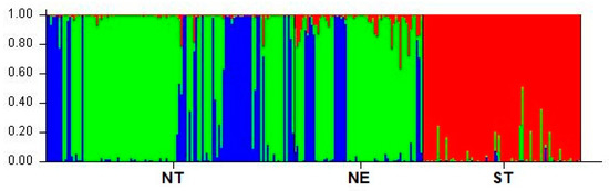 Individual membership of Thai indigenous pig populations at optimal cluster K = 3 estimated by the program STRUCTURE. Possible clusters are indicated by three colors: cluster 1 (red), cluster 2 (green), and cluster 3 (blue). The scale represents the proportion of membership in a total number of 100%. Three Thai indigenous pig populations originated from three regions (NT = north, NE = northeast, and ST = south).