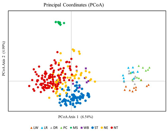 Principal coordinate analysis (PCoA) of individuals from nine pig populations. Pig populations: LW = Large White; LR = Landrace; DR = Duroc; PC = Pak Chong 5 crossbred; MS = Meishan; WB = Thai wild boar; ST = Southern Thai pig; NE = Northeastern Thai pig; NT = Northern Thai pig.