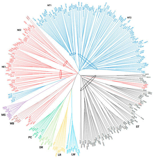 Neighbor Joining phylogenetic tree reconstructed from shared allele distances of 312 individual pigs. Pig populations are color coded: NT = Northern Thai pigs (blue); NE = Northeastern Thai pigs (red); ST = Southern Thai pigs (black); LW = Large White (light blue); LR = Landrace (yellow); DR = Duroc (yellowish green); PC = Pak Chong 5 crossbred (green); WB = Thai wild boar (brown); MS = Meishan (purple). NE1, NE2, NT1, and NT2 were subgroups. The oval line indicates the members of the group or subgroup. Sample identification numbers are shown. Provincial abbreviations: CM = Chiang Mai; CR = Chiang Rai; KB = Krabi; LE = Loei; LP = Lamphun; MH = Mae Hong Son; NA = Nan; NP = Nakhon Phanom; NS = Nakhon Si Thammarat; PG = Phangnga; PT = Pattani; PY = Phayao; SR = Surat Thani; TK = Tak; TR = Trang; UB = Ubon Ratchathani.