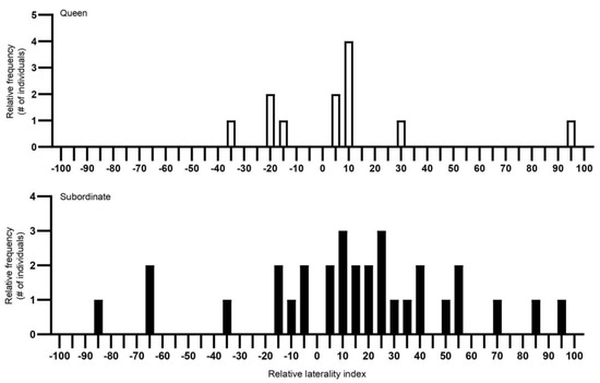 The relative frequency (Y-axis) of Damaraland mole rat (Fukomys damarensis) queens’ (n = 11) and non-reproductive subordinates’ (n = 29) individual laterality along a laterality index (X-axis). The Y-axis scale represents the frequency of individuals with the same lateral index. The X-axis scale from the left represents right turning, with increased turning to the left as the index increased from −100 to 100. A laterality index value of 0 means that an individual turned left and right in equal amounts, demonstrating no turning biases. White bars represent queens and black bars represent subordinates. #—number.