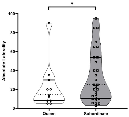 The absolute laterality (directional strength in laterality) in the Damaraland mole rat Fukomys damarensis between queens (open circles: n = 11) and non-reproductive subordinates (open squares: n = 29). The dashed line represents the median, with solid lines representing the upper and lower quartiles. * indicates significance at p < 0.05.
