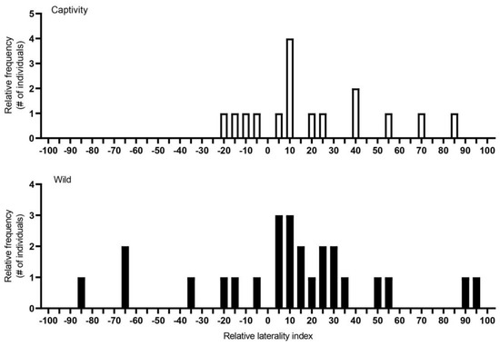 Population-level laterality refers to the condition where most individuals from a population have the same lateralized one directional bias—for example, human handedness [14,19,24]. It has been proposed that when individually asymmetric organisms must interact with conspecifics and coordinate their activities, asymmetry aligns in the majority of individuals in a population [17,20,30]. This suggests that social species are more likely to show population-level asymmetries, as social species are more likely to interact and coordinate socially [24,31,32]. In turn, members within a social group may experience greater fitness benefits when performing the same behavioral stratagem [17]. Currently, the evolution of individual lateralization does not predict any population-level lateralization [20]. It is possible that processes involving individual laterality do not influence population-level laterality if not relevant in a social context. In addition, if population-level asymmetries are present in solitary species, they should be less strongly lateralized or absent as opposed to species that interact socially [20,30].
