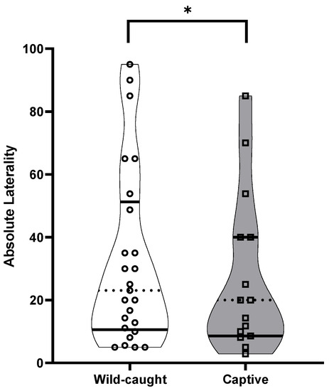 The absolute laterality (directional strength in laterality) in the Damaraland mole rat Fukomys damarensis between wild-caught (open circles: n = 25) and captive animals (open squares: n = 15). The dashed line represents the median, with solid lines representing the upper and lower quartiles. * indicates significance at p < 0.05.