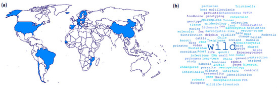 (a) Worldwide research institutions (n = 44) from 18 countries participating in the interdisciplinary Special Issue on Parasites and Wildlife. (b) Word cloud with the keywords utilized by each research paper. Brazil (n = 2): University of São Paulo, University Santo Amaro; Chile (n = 2): Universidad de Chile, Universidad de Concepción; China (n = 3): Guizhou University, Provincial Key Laboratory for Agricultural Pest Management in Mountainous Region, Dali University; Denmark (n = 3): University of Copenhagen, Technical University of Denmark, Statens Serum Institut; Estonia (n = 2): Estonian Veterinary and Food Laboratory, Estonian University of Life Sciences; Finland (n = 1): University of Helsinki; Germany (n = 2): Leibniz Institute for Zoo and Wildlife Research, Freie Universität Berlin; Hungary (n = 2): University of Veterinary Medicine, Centre for Agricultural Research; Iceland (n = 1): Icelandic Institute of Natural History; Italy (n = 5): Istituto Zooprofilattico Sperimentale del Piemonte, Liguria e Valle d’Aosta, Local Veterinary Services in Imperia, University of Siena, University of Teramo, Local Veterinary Services in Asti; Lithuania (n = 2): Vytautas Magnus University, Nature Research Centre; Mozambique (n = 1): Universidade Licungo; Poland (n = 1): National Veterinary Research Institute; Senegal (n = 1): Jane Goodall Institute Senegal; Spain (n = 11): Institutes of Health Carlos III, Jane Goodall Institute Spain, Complutense University of Madrid, University of Las Palmas de Gran Canaria, Mundomar, Universidad de Córdoba, Universidad de Castilla-La Mancha, Consejo Superior de Investigaciones Científicas, Universidad de Málaga, Universidad San Pablo-CEU, Junta de Andalucía; Sweden (n = 1): Lund University; Switzerland (n = 1): University of Zurich; USA (n = 3): Ohio State University, Department of Health and Human Services, Food and Drug Administration, United States Department of Agriculture.