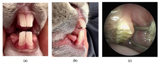 Cat skull and teeth: semi profile view (a), lack of adhesion of the side teeth—scissor arrangement (b,c) (by Małgorzata Peruga).