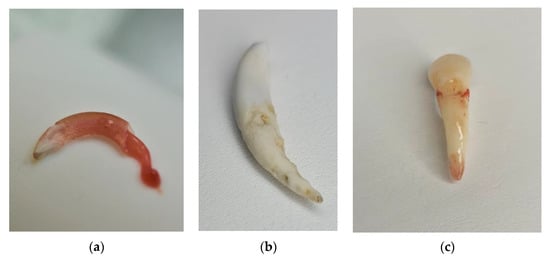 Celebi et al. [26] used the domestic cat as a research model in hormonal testing. However, cats have no masticating surfaces (Figure 5a–c). The arrangement of their teeth in the dental arches and high degree of nodularity precludes using cats for orthodontic research, unless the bite is raised, which the authors did not mention describing their methodology (Table 2). Although cats are used as laboratory animals, due to the fact that their brain demonstrates the closest similarity to humans, these animals are primarily used in neurological, ophthalmological, and immune deficiency research, and not in hormonal and orthodontic studies.