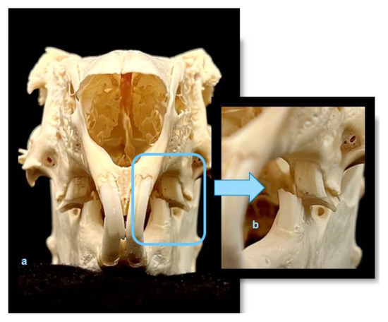 Rabbits, and specifically their thigh bones, are used in dentistry as a material for research into the osseointegration of implants. However, rabbit is an animal with a fragile anatomical structure, in particular its limbs, which often fracture under a load. Rabbits not only show little aggression toward humans but are also the smallest and the cheapest animals whose sperm can be harvested and used for artificial insemination. They produce tears and have large eyeballs, which facilitates the testing of chemical substances. However, apart from research into irritating substances, there is scant information available on other experimental studies. Poosti et al. [29] demonstrated that orthodontic movement changed after a female rabbit was provided with hormones from a human female that have a different chemical structure to their own hormones. The teeth of rabbits (Figure 2a–c), namely the incisors and the molars, can grow throughout their lifetimes. The incisors grow even two to three millimeters per week. Rabbits’ teeth consist of clinical and anatomic crowns almost entirely covered by a layer of enamel absent at the top of the tooth, in the growth center. The PDL area is very limited (Figure 3a–c), which modifies the tooth behavior under loading with occlusal or orthodontic forces [32,33,34]. Mastication is also very different compared with humans. After reaching occlusal interdigitation, the rabbits’ mandibular teeth rest on pegs (second part of the maxillary incisors) in a reversed overjet. To achieve normal occlusion, a rabbit must unilaterally and partially dislocate the mandibular condylar process from the fossa to close the arcade (Figure 4a,b).