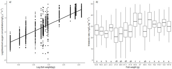 (a) Scatterplot of the log dissolved oxygen concentration vs. log weight of Halobatrachus didactylus. The line represents a linear model fit to the data. (b) Mass-corrected routine metabolic rate for H. didactylus individuals of varying weights. Different letters below the boxplot indicate statistical results from ANOVA (F-statistic: 53.46, p-value: <2.2 × 10−16) followed by a Tukey pairwise comparison (differences with p < 0.05 have different letters).