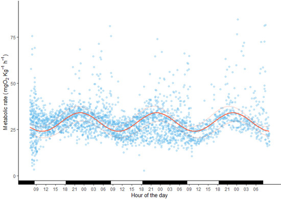 Metabolic rate (mg O2 kg−1h−1)= 5 (+/−0.5) × sine (2 × π × 1 (+/−0.01) × time of day + 5.3 (+/−0.1)) + 29 (+/−3).