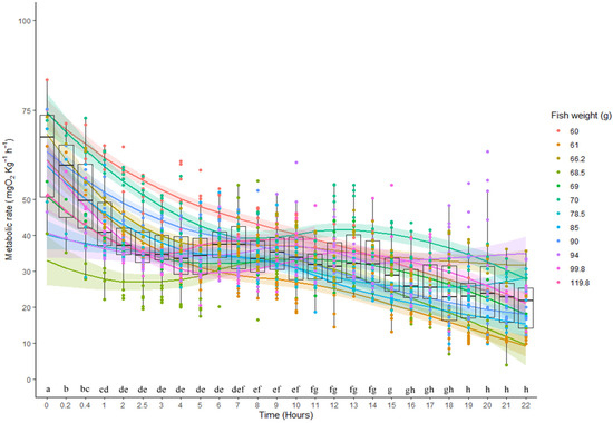Metabolic rate of Halobatrachus didactylus individuals of different weights (lines represent the spline models fitted to the data of each fish) subjected to the exhaustive chase protocol (immediately before hour 0), and subsequent recovery in a 22 h period. Letters show the result of nested Tukey pairwise comparisons (differences with p < 0.05 have different letters) between the means of each time range.