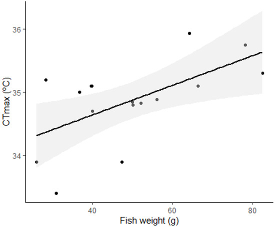 The fit of the CTmax to weight showed a low positive correlation (R2: 0.380, n = 16, F: 3.094, p = 0.039).