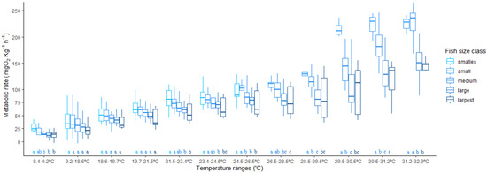 Acute temperature change effect of metabolic rate in different size classes of Halobatrachus didactylus. Letters show the results of the nested Tukey pairwise comparisons (differences with p < 0.05 have different letters).