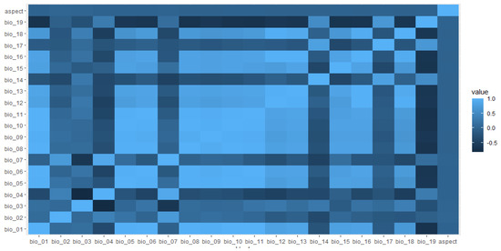 Spearman pairwise correlation coefficients between predictive variables aspect, mean annual temperature (bio_01), mean diurnal range (bio_02), iso-thermality (bio_03), temperature seasonality (bio_04), maximum temperature of the warmest month (bio_05), minimum temperature of coldest month (bio_06), temperature annual range (bio_07), mean temperature of wettest quarter (bio_08), mean temperature of driest quarter (bio_09), mean temperature of the warmest quarter (bio_10), mean temperature of coldest quarter (bio_11), annual precipitation (bio_12), precipitation of wettest month (bio_13), precipitation of driest month (bio_14), precipitation seasonality (bio_15), precipitation of driest quarter (bio_16), precipitation of wettest quarter (bio_17), precipitation of the warmest quarter (bio_18) and precipitation of the coldest quarter (bio_19) considered in the Egyptian vulture nesting habitat distribution model, Nepal. Color variation indicates correlation values.