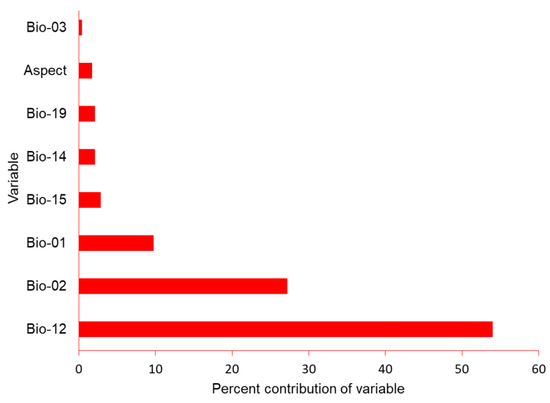 Percent contribution of climactic variables aspect, mean annual temperature (bio_01), mean diurnal range (bio_02), iso-thermality (bio_03), annual precipitation (bio_12), precipitation of wettest month (bio_13), precipitation of driest month (bio_14), precipitation seasonality (bio_15) and precipitation of the coldest quarter (bio_19) for model construction for the potential distribution of suitable nest habitat for Egyptian vultures, Nepal.