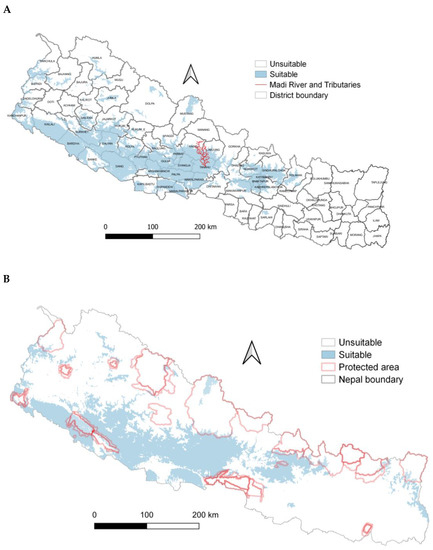 (A) Potential suitable nest habitat of Egyptian vultures, Nepal. (B) Potential suitable nest habitat of Egyptian vultures and protected areas, Nepal.