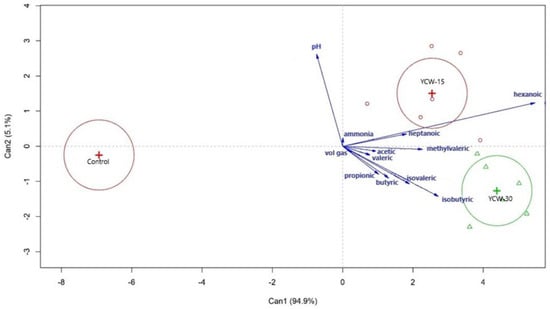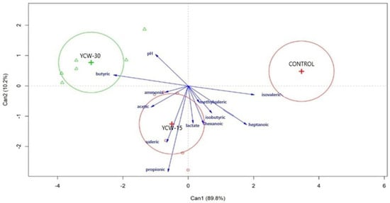 The proximity and longitude of the vectors within each group express the relationships among the groups and variables. The correlation among the variables is represented by the angle formed among their vectors. Propionic, valeric, acetic, lactic, hexanoic, 4 methylvaleric, and isobutyric acid were the most affected by YCW-15. Butyric acid and the pH were more affected by YCW-30. Ammonia showed a low correlation with the treatments. However, a trend in the cats fed YCW-15 and YCW-30 was observed.