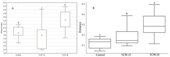 Microbiome alpha diversity (A) and beta diversity (B) of control, YCW-15, and YCW-30 groups. a,b,c Boxplots with the same letter are similar.