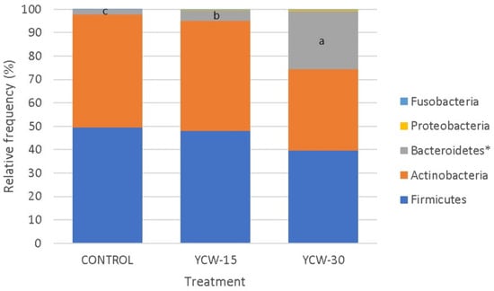 Relative frequency variation of the main fecal bacterial phyla in control, YCW-15, and YCW-30 groups. a,b,c Boxes with the same letters are similar at p ≤ 0.003. * Phylum with significant differences.