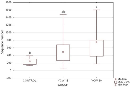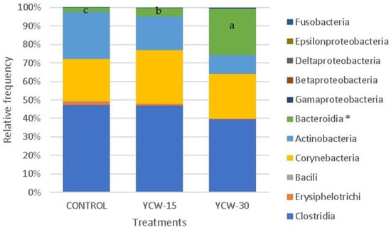 Relative frequency variation of the main fecal bacterial classes in control, YCW-15, and YCW-30 groups. a,b,c Boxes with the same letters are similar at p ≤ 0.0015. * Classes with significant differences.