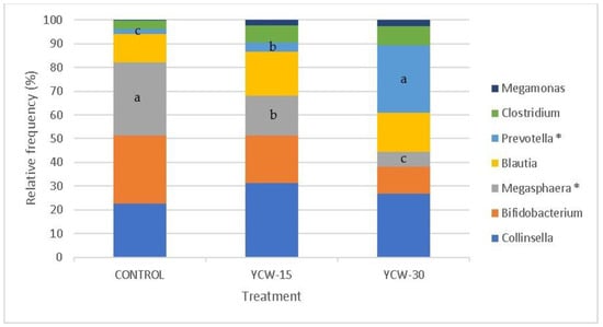 Relative frequency variation of the main fecal bacterial genera in control, YCW-15, and YCW-30 groups. a,b,c Boxes with the same letters are similar at p ≤ 0.00238i. * Genera with significant differences.