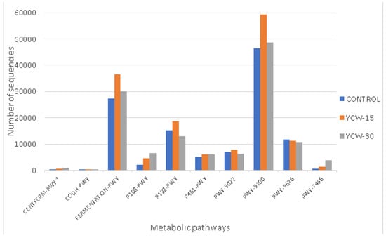 The CENTFERM-PWY pathway tended to be different (p = 0.086) in the YCW-30 group compared to the control (Figure 7).