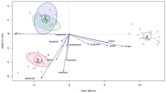 The descriptive data of the fecal pH and the fermentation products are presented in Table 4. The treatment effects were assessed for these data via a multivariate analysis (Table 5 and Figure 1).