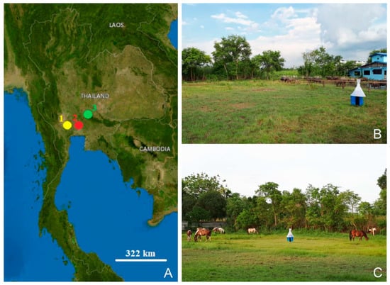 - Changbunjong, T.; Weluwanarak, T.; Ratanakorn, P.; Maneeon, P.; Ganpanakngan, M.; Apiwathnasorn, C.; Sungvornyothin, S.; Sriwichai, P.; Sumruayphol, S.; Ruangsittichai, J. Distribution and Abundance of Stomoxyini flies (Diptera: Muscidae) in Thailand. Southeast Asian J. Trop. Med. Public Health 2012, 43, 1400–1410. [Google Scholar] [PubMed]