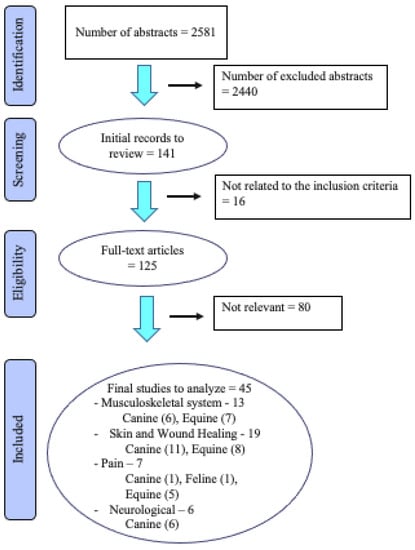 A total of 2581 abstracts were identified from the three electronic databases (Figure 1). Duplicates were removed and the abstracts were re-evaluated using the inclusion criteria. A total of 125 publications were studied in detail. Regarding laser treatment of the musculoskeletal system, 50 studies were identified, of which 28 were dog studies, 22 were on horses, and none were cat studies. Thirteen of these met the inclusion criteria. Regarding the effects of laser on skin and wound healing, 44 abstracts were identified, of which 32 were dog studies, 12 were studies of horses, and none were regarding cats. Nineteen of these met the inclusion criteria. In the treatment of pain with laser, three studies were regarding dogs, one was regarding cats, and six studies were on horses. Seven of these were included. Of 20 dog studies regarding laser treatment for various neurological conditions, 6 studies met the inclusion criteria. A horse study was identified; however, it did not meet the inclusion criteria. The studies that did not meet the inclusion criteria were case reports, review articles, method articles, or had phototherapy as part of a combination of treatments, which made the evaluation of phototherapy as a single treatment impossible.