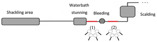 Position of the observers during the assessment of animal-based indicators of the effectiveness of waterbath stunning in turkeys. The position of the lens is the position of the observers (i.e., before (1) and during bleeding (2)) and the red segments are the observation area.