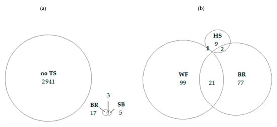 Venn diagram of the animal-based indicator of consciousness assessed in waterbath-stunned turkeys (a) before bleeding and (b) during bleeding. Indicators of consciousness are: no TS: absence of tonic seizure; BR: presence of breathing; SB: presence of spontaneous blinking; WF: presence of wing flapping; HS: presence of head shaking; SS: presence of spontaneous swallowing. Numbers specify the total amount of turkeys showing each indicator or combinations of indicators from a total of 3659 turkeys assessed before bleeding and 4218 during bleeding.