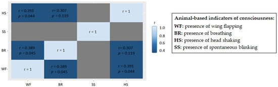 Unlike before bleeding, during bleeding there was correlation among the ABIs as shown in Figure 3. All correlations were positive, but only the presence of breathing and wing flapping (r = 0.389) and wing flapping and head shaking (r = 0.391) were statistically significant (p < 0.05).