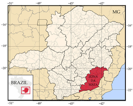 - Abreu, R.L.d. Map Locator of Minas Gerais Zona da Mata Mesoregion. 2006. Available online: https://pt.wikipedia.org/wiki/Zona_da_Mata_Mineira#/media/Ficheiro:MinasGerais_Meso_ZonadaMata.svg (accessed on 2 February 2023).