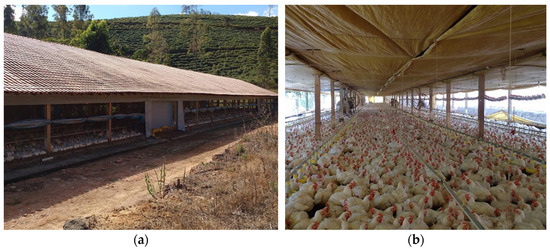 Open facilities for the production of broilers typical of the Zona da Mata of Minas Gerais (MG), Brazil; (a) external view and (b) internal view.