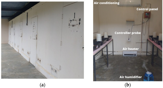 The experiment was carried out in 4 climatic chambers (Figure 3a) built in the dimensions of 2.4 m × 3.3 m × 2.5 m (height, length and width), located in the experimental area of the Center for Research in Ambience and Engineering of Agroindustrial Systems (AMBIAGRO), from the Department of Agricultural Engineering (DEA) of the Federal University of Viçosa (UFV), in Viçosa, Minas Gerais. Each climate chamber was equipped (Figure 3b) with an air conditioning apparatus type hot/cold 12,000 BTU/h, an electrical resistance heater with a power of 2000 W and a humidifier air with mist flow rate of 300 mL/h with a capacity of 4.5 L. The conditioner, heater and humidifier were activated or turned off by electronic digital control of temperature and humidity (MT-531Ri plus, Full Gauge Controls, Canoas, Brazil), according to pre-established values. The air renewal inside the climatic chambers was done by means of axial exhausts, activated automatically.