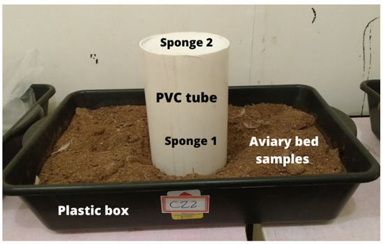 The aviary bed samples were individually arranged in rectangular plastic boxes (Figure 4) with a volume of 20 L in the following dimensions: 60 cm long, 38 cm wide and 16 cm high. According to the depth adopted in the facilities for broiler production the boxes were filled with the aviary bed up to the height of 10 cm. In the center of the box it was placed an equipment for fixation of the volatilized ammonia (Figure 4), according to the methodology SMDAE [74]. This method, called “Saraz Method for Determination of Ammonia Emissions” (SMDAE), is based on the mass diffusion method for the determination of ammonia flux from broiler bedding, based on the total volatilized ammonia content that is volatilized and captured. The NH3 capture device uses a PVC tube 20 cm in diameter and 30 cm high and two polyurethane sponges 20 cm in diameter and 2 cm thickness positioned inside the tube at 10 cm (sponge 1) and 30 cm (sponge 2) from the base of the PVC collector. Sponge 1 captures the flow of ammonia by the bed, and sponge 2 prevents contamination of the sample by external gases [74].
