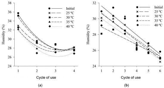 In general, the initial moisture values of the wood shaving bed and coffee husk bed were higher than the moisture values of the beds after being subjected to different thermal conditions for all reuse cycles tested (Figure 5). The values of moisture in the shaving bed in the first cycle of use ranged from 32 to 36%, showing a drop to about 28% in the fourth cycle of use (Figure 5a). The bed of coffee husks showed a decreasing behavior of moisture, in the linear case, due to the increase in the number of cycles of use, and in the first cycle of use an average value of 30% was observed, while in the sixth cycle of use an average content of 25% was obtained (Figure 5b).