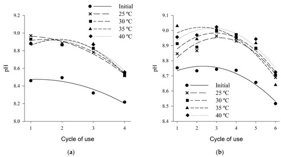 Initial pH values (before beds were submitted to treatments) ranged from 8.5 to 8.2 for shaving bed, and from 8.7 to 8.5 for coffee husk (Figure 6). Similar values, ranging from 7.9 to 8.5, were observed by Marín et al. (2015) [41], for both shaving and coffee husks beds, from the first to the fourth reuse cycle.