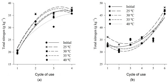According to the experimental conditions of this study, when the beds were submitted to the different thermal treatments, only losses by volatilization of ammonia occurred, without any form of nitrogen increment. Consequently, it can be observed that the higher total nitrogen contents were observed at lower temperatures, being this behavior more outstanding for the bed of shavings. Thus higher air temperatures influence the losses of nitrogen to the environment by favoring the volatilization of ammonia, as reported by several authors [85,88].