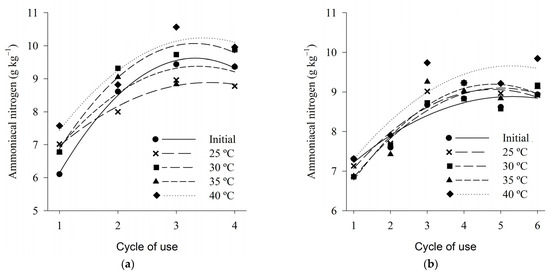 In order to estimate the ammonia generation and emission potential, multiple equations were adjusted as a function of the reuse cycle and temperature, and the linear, quadratic and cubic effects of these variables were tested. Subsequently, the models were reduced by excluding non-significant variables using the “backward” method. All equations were adjusted using the SAS procedure REG [80], considering a 0.05 significance level.