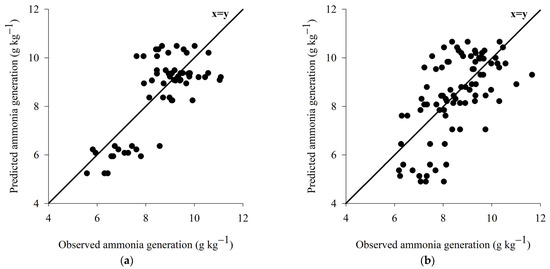 Representation of the prediction models of the ammonia generation potential for wood shaving bed (a) and coffee husk bed (b).