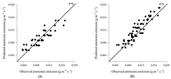 To assess the adequacy of multiple equations developed to predict potential generation and emission of ammonia, a cross-validation analysis was performed [81]. The analysis was performed from 1000 simulations, using the least squares linear function of R [82] and the packages “boot” and “mass”. For each simulation, the original database was randomly split into two new subsets of approximately the same size. The first subset (generation subset) was used to obtain the estimates and the second subset (test subset) was used to test the estimates to obtain the statistical adequacy measures. After each simulation, the database was reorganized, and the whole process repeated 1000 times, to take the average of adequacy statistics.