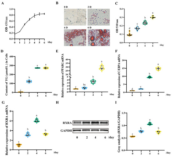 The expression pattern of duck RXRA in the duck preadipocytes (DPACs). (A) Multiplication curve of the DPACs. (B) Fat content of the DPACs induced by the differentiation medium at 0, 2, 4, and 6 days. The images were taken under 200× magnification. (C) OD 510/nm: absorbance at 510 nm. (D) Triglyceride (TG) content at 0, 2, 4, and 6 days of the induced DPACs. (E) The genes expression changes of the induced DAPCs. (E) The PPARG gene expression of the induced DAPCs. (F) The C/EBPA gene expression of the induced DAPCs. (G) The RXRA gene expression of the induced DAPCs. (H,I) Changes in RXRA protein expression in the DPACs induced. The data are reported as the mean ± SD on the basis of n = 3 independent experiments. a,b,c,d Significant differences are shown in superscript letters, with different letters representing significant differences (p < 0.05). Original Western blot figures in Figure S1.