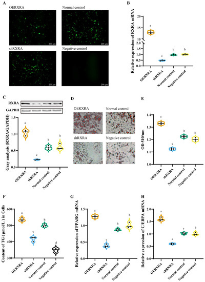 Effect of RXRA gene on the lipid metabolism of the DPACs. (A) The transfections of overexpression RXRA (OERXRA), knockdown RXRA (shRXRA), blank plasmid (Normal control), and culture medium (negative control) into the DPACs were observed under a fluorescence microscope. (B) The RXRA gene mRNA expression. (C) The indicated protein levels were detected by a Western blot analysis, and the relative fold change in RXRA/GAPDH determined by Western blotting was quantified through a grayscale scan. (D) Intracellular fat content. The images were taken under 200× magnification. (E) OD 510/nm: absorbance at 510 nm. (F) TG content in the DPACs. (G) The mRNA expression of PPARG gene. (H) The mRNA expression of C/EBPA gene. The data are reported as the mean ± SD on the basis of n = 3 independent experiments. a,b,c,d Significant differences are shown in superscript letters, with different letters representing significant differences (p < 0.05). Original Western blot figures in Figure S2.