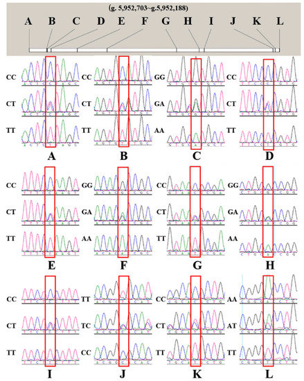 The peak maps of all genotypes of the SNPs. (A): g.5,952,703 C > T; (B) g.5,952,667 C > T. (C) g.5,952,666 G > A. (D) g.5,952,658 C >T. (E) g.5,952,604 C > T. (F) g.5,952,543 G > A. (G) g.5,952,400 C > T. (H) g.5,952,353 G > A. (I) g.5,952,343 C > T. (J) g.5,952,201 T > C. (K) g.5,952,197 C > T. (L) g.5,952,188 A > T.