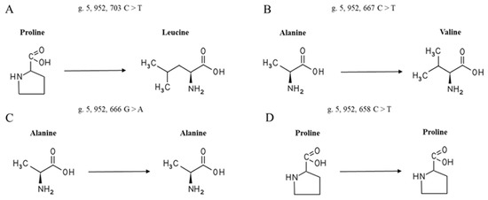 Through sequence alignment, single nucleotide mutations were found to cause amino acid changes in the duck population, where g.5,952,703 C > T causes the missense mutation of proline at position 28 to leucine (Figure 4A) and g.5,952,667 C > T causes an alanine missense mutation at position 40 to valine (Figure 4B); g.5,952,666 G > A and g.5,952,658 C > T are synonymous mutations (Figure 4C,D).