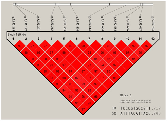 The results of the linkage disequilibrium analysis for the RXRA SNPs are shown in Figure 5. The LD map shows the SNPs of the RXRA gene, and vital LD regions were detected. There are two haploids in this block. The frequencies of H1 (TCCCGTGCCGTT) and H2 (ATTTACATTACC) were 0.717 and 0.240, respectively. The relationship between haplotype and growth traits was analyzed. The analysis results are shown in Table 4. The ADFI, RFI, and FCR of the H1H1 haplotype combination were lower than those parameters of the H1H2 and H2H2 groups and had no correlation with the ADG.
