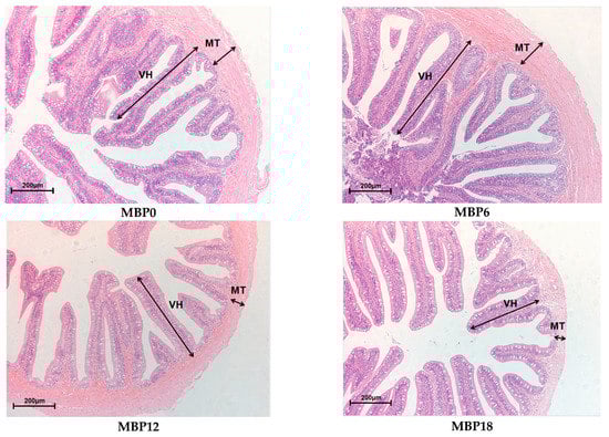 Effects of FM being replaced by MBP on intestinal morphology of the juvenile American eel. VH: villus height; MT: muscular thickness. Magnification ×200.