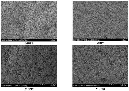 As shown in Figure 1 and Table 7, the villus height and muscular thickness of the intestine in the MBP12 and MBP18 groups were significantly lower than those in MBP0 and MBP6 groups (p < 0.05), and the lowest values were both observed in the MBP18 group. As evidenced in the SEM view, the intestinal microvillus density in MBP12 and MBP18 groups was sparser than those in MBP0 and MBP6 groups, and there was certain damage to the intestinal microvillus in the MBP18 group (Figure 2).