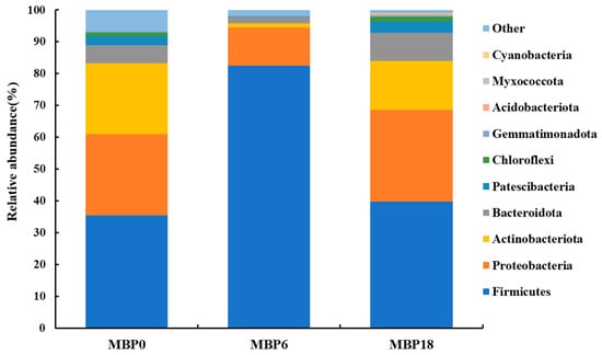 As shown in Figure 3, although there were no significant differences in richness indexes (Chao 1 and Observed_species) or diversity (PD_whole_tree and Shannon) among all the groups (p > 0.05), there was an increasing trend in these measures of the MBP18 group compared with the MBP0 group. At the phylum level (Figure 4), Firmicutes, Proteobacteria, Actinobacteriota, and Bacteroidota were the four predominant bacteria in MBP0, MBP6, and MBP18 groups. Compared with the MBP0 group, the relative abundance of Firmicutes in the MBP6 group was increased, while the relative abundances of Proteobacteria, Actinobacteriota, and Bacteroidota in the MBP6 group were decreased. No obvious differences in the relative abundance of Firmicutes or Proteobacteria were found between the MBP0 and MBP18 groups. The relative abundance of Actinobacteriota in the MBP18 group was lower than that in the MBP0 group, while the relative abundance of Bacteroidota in the MBP18 group was higher than that in the MBP0 group.